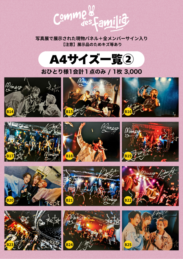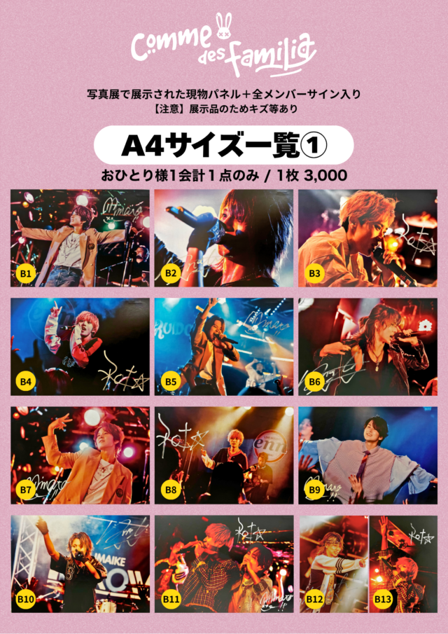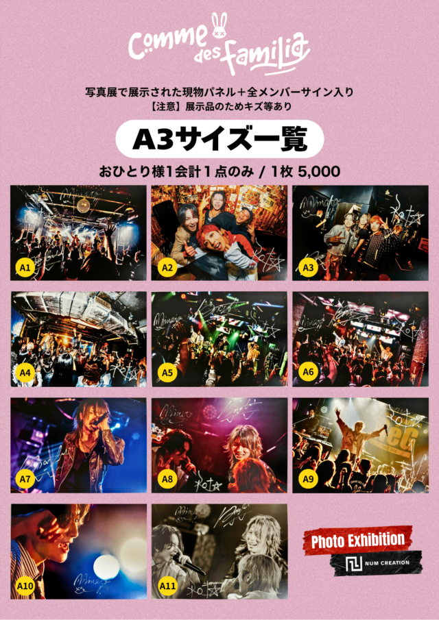 Comme des familia ワンマンライブ After Partyにて、NUM CREATION 写真展『兎者修行シーズン2』で展示された、メンバー全員のサイン入り写真パネルの販売が決定いたしました。